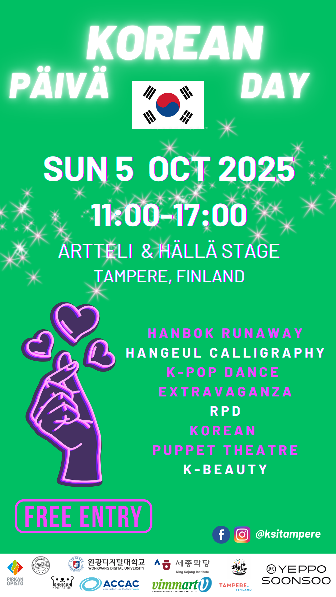 Korean kulttuuri valtaa Tampereen sunnuntaina 5.10.! Korean päivä on täällä! Arttelissa su 5.10.2025 klo 11–15 on luvassa monipuolista ohjelmaa ja työpajoja, kuten Hanbok-muotinäytös, Finnish K-pop…