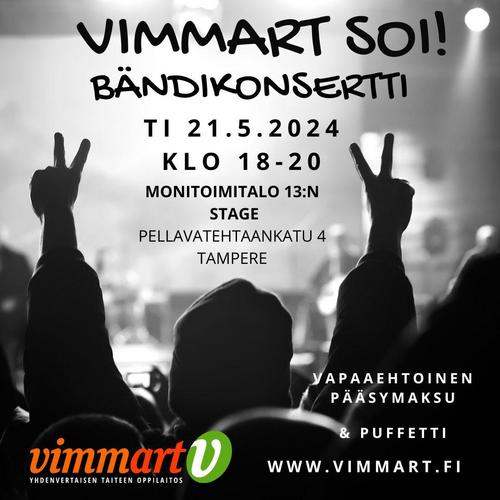 Vimmart -yhdenvertaisen taiteen oppilaitos järjestää musiikkikoulun bändien kevätkonsertin Monitoimitalo 13 Stagella. Konserttiin on vapaaehtoinen pääsymaksu. Myös puffetissa hieman herkkuja tarjolla.(käteismaksu - mobilepay)