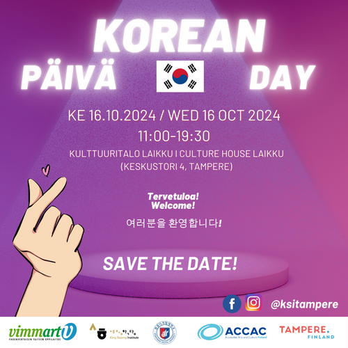 Tampereen King Sejong -instituutti kutsuu sinut keskiviikkona 16.10.2024 klo 11-19:30 Kulttuuritalo Laikkuun viettämään maksutonta ja kaikille avointa Korean päivää. Päivän aikana pääset nauttimaan monipuolisista esityksistä, osallistumaan inspiroiviin työpajoihin ja kuuntelemaan mielenkiintoisia luentoja. Samalla juhlistamme Koreassa merkittävää Hangeul-kielen juhlapäivää sekä Tampereen King Sejong -instituutin 2-vuotissynttäreitä. Tervetuloa sukeltamaan korealaiseen kulttuuriin!