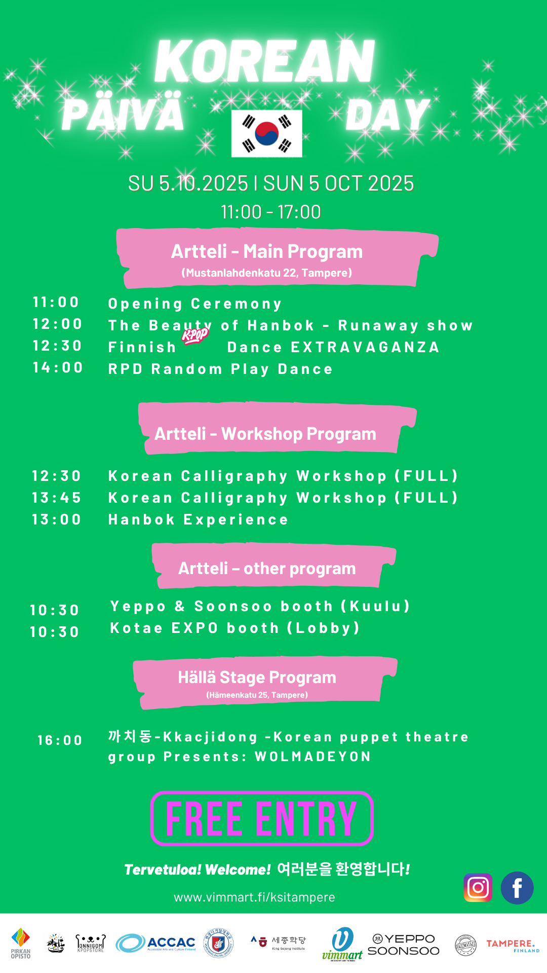 Tämä kolmannen kerran järjestettävä korealaisen kulttuurin juhla tarjoaa mm. k-pop -tanssia, korealaista nukketeatteria, hanbok-muotinäytöksen, kalligrafia-työpajoja ja kosmetiikkanäytteitä – sekä paljon muuta. Lämpimästi tervetuloa kokemaan Korea hetkessä!