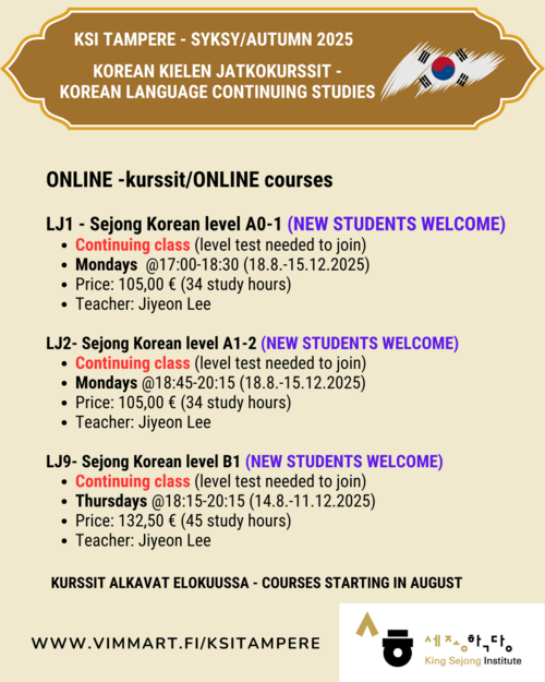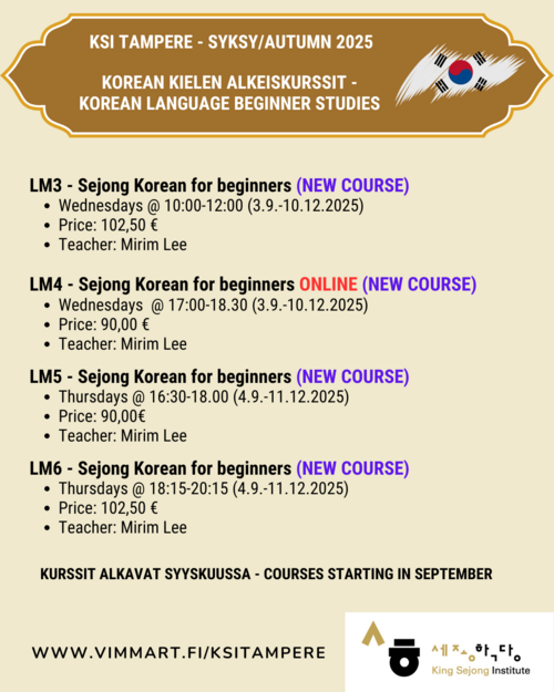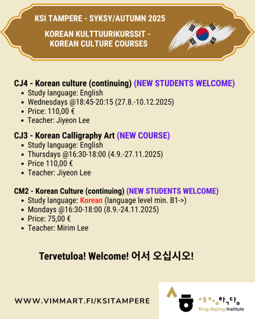 KSI Tampere Autumn 2025 course registration is now open! We offer Korean language courses from beginner to level B1, Korean culture courses and calligraphy.