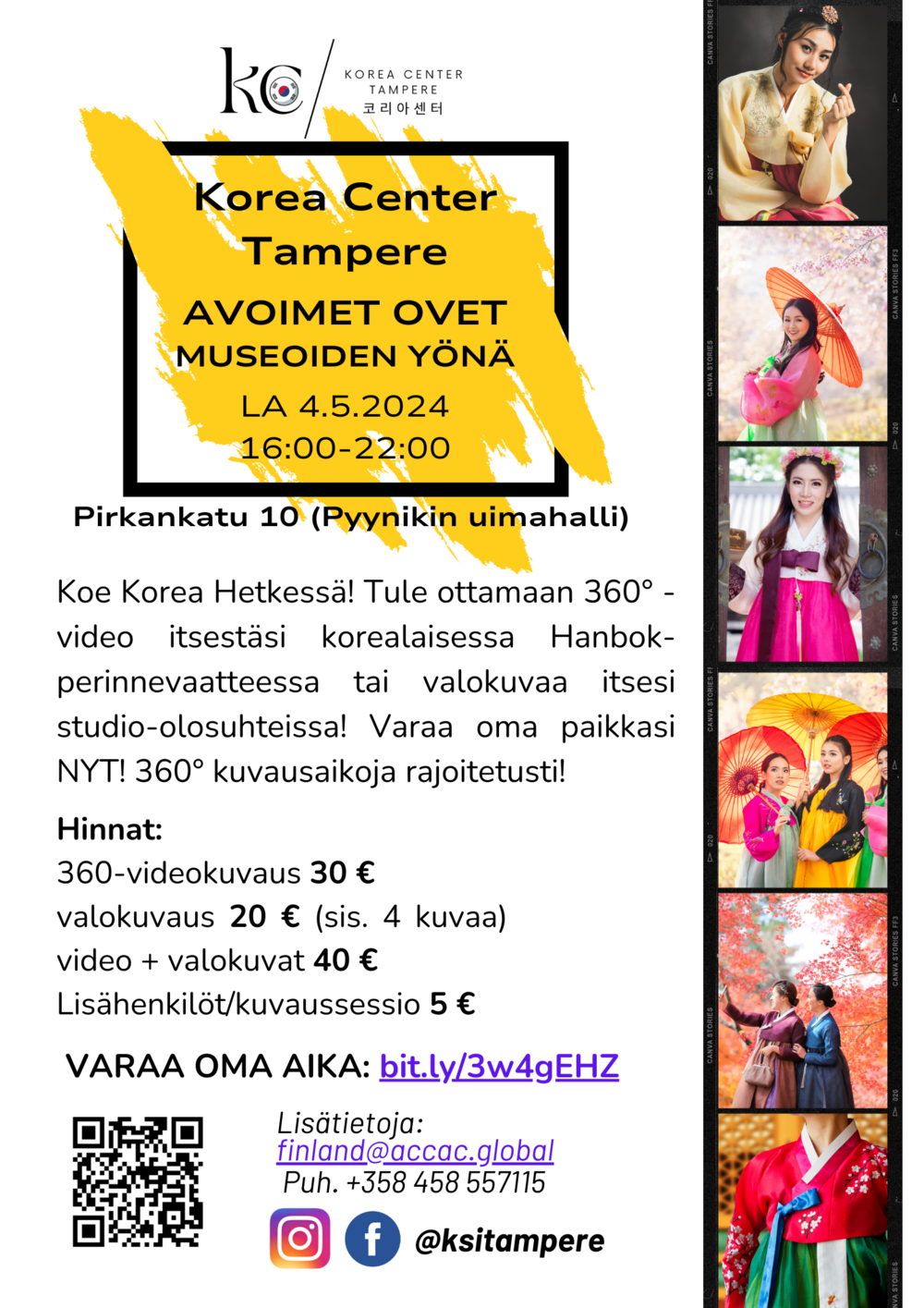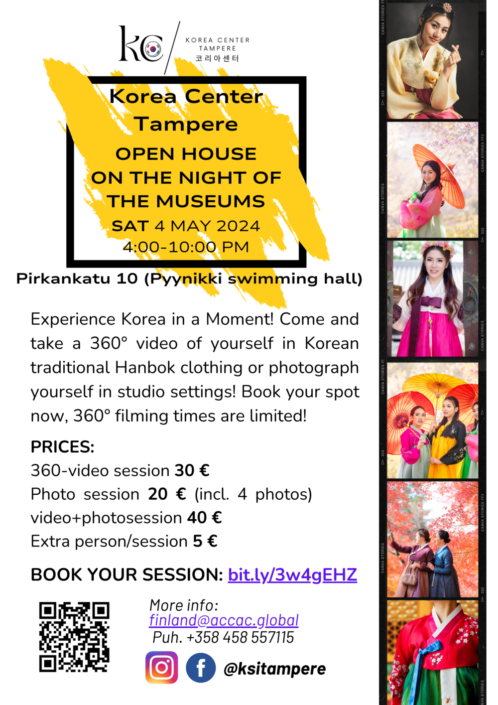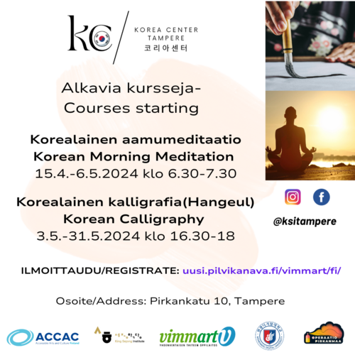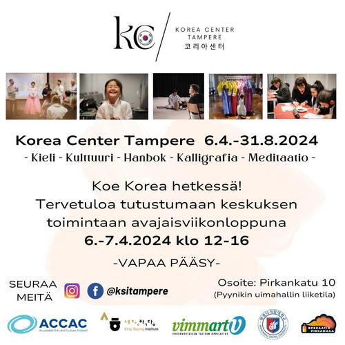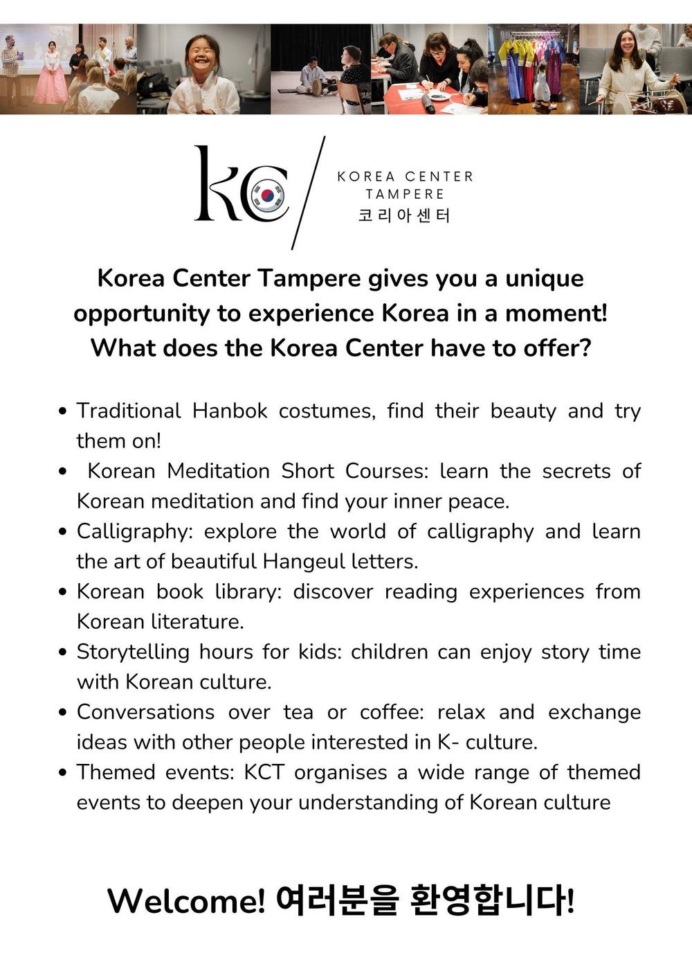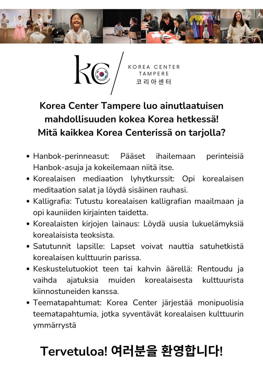 Tampereen keskustan tuntumaan huhtikuussa 2024 avautuva Korea Center Tampere luo ainutlaatuisen mahdollisuuden kokea Korea hetkessä. Keskukseen tulee esille mm. värikästä hanbok -perinneasuloistoa näyttelyn muodossa sekä paljon muuta koettavaa korean kielestä ja kulttuurista. Järjestämme myös erilaisia tapahtumia ja kursseja. Han-ryu (한류) eli korealaisen kulttuurin aalto levinnyt ympäri maailmaa, ja nyt pääset kokemaan sen myös Tampereella! Pilottihankkeena käynnistyvän keskuksen yhteistyökumppaneina toimivat ACCAC Finland/Esteetön taide ja kulttuuri ry sekä Vimmart -yhdenvertaisen taiteen oppilaitos/Tampereen King Sejong -instituutti . Tervetuloa! 여러분을 환영합니다!