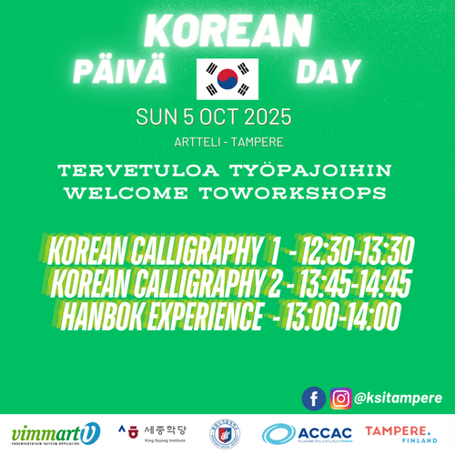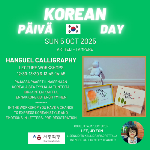 Tunnetko korealaista kalligrafiaa? Hangul on korean kielen aakkosten nimi. Kalligrafia taas tarkoittaa "käsin piirrettyjä merkkejä", jossa arvostetaan yksilöllistä ilmaisua ja sattumaa. Se ei ole mekaanista ilmaisua vaan kaunista ja ainutlaatuista käsialaa. Työpajassa pääset ilmaisemaan korealaista tyyliä ja tunteita kirjainten kautta.