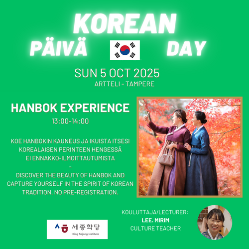 Tervetuloa kohtaamaan Hanbokin kauneus! .Tässä työpajassa sinulla on mahdollisuus päästä kokeilemaan Hanbokia, korealaista perinneasua ja ottamaan kuva itsestäsi valitsemassasi ympäristössä. Koe korealainen kauneus!